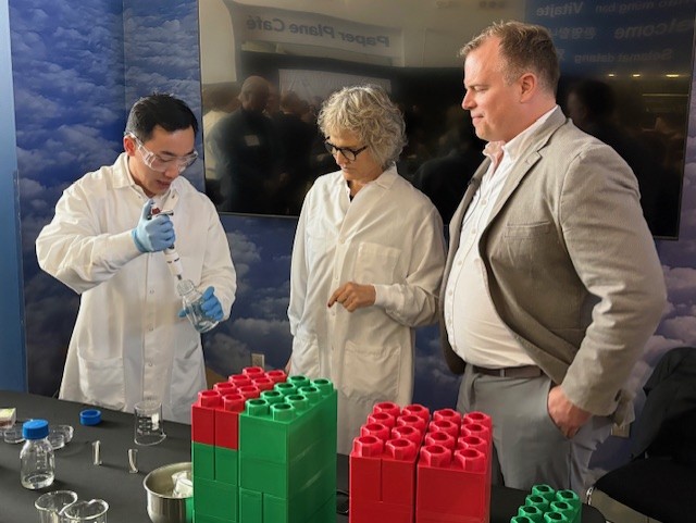 WSU President Betsy Cantwell, flanked by WSU Tri-Cities researchers Harrison Yang and Josh Heyne at the university’s demonstration table for the Jan. 8, 2026 announcement of the new Cascadia Sustainable Aviation Accelerator (photo courtesy of WSU)