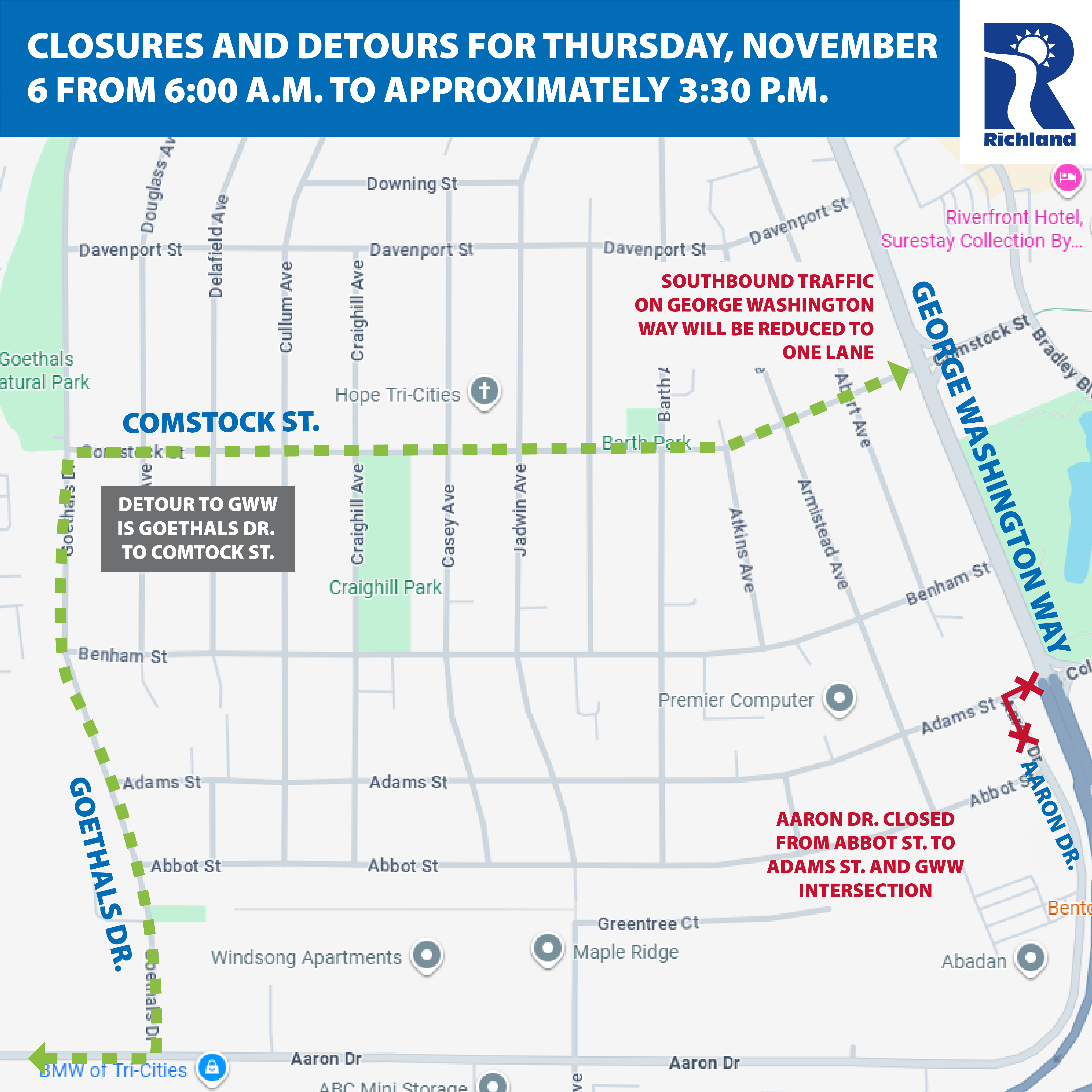 • A detour will be in place via Comstock Street and Bradley Boulevard.