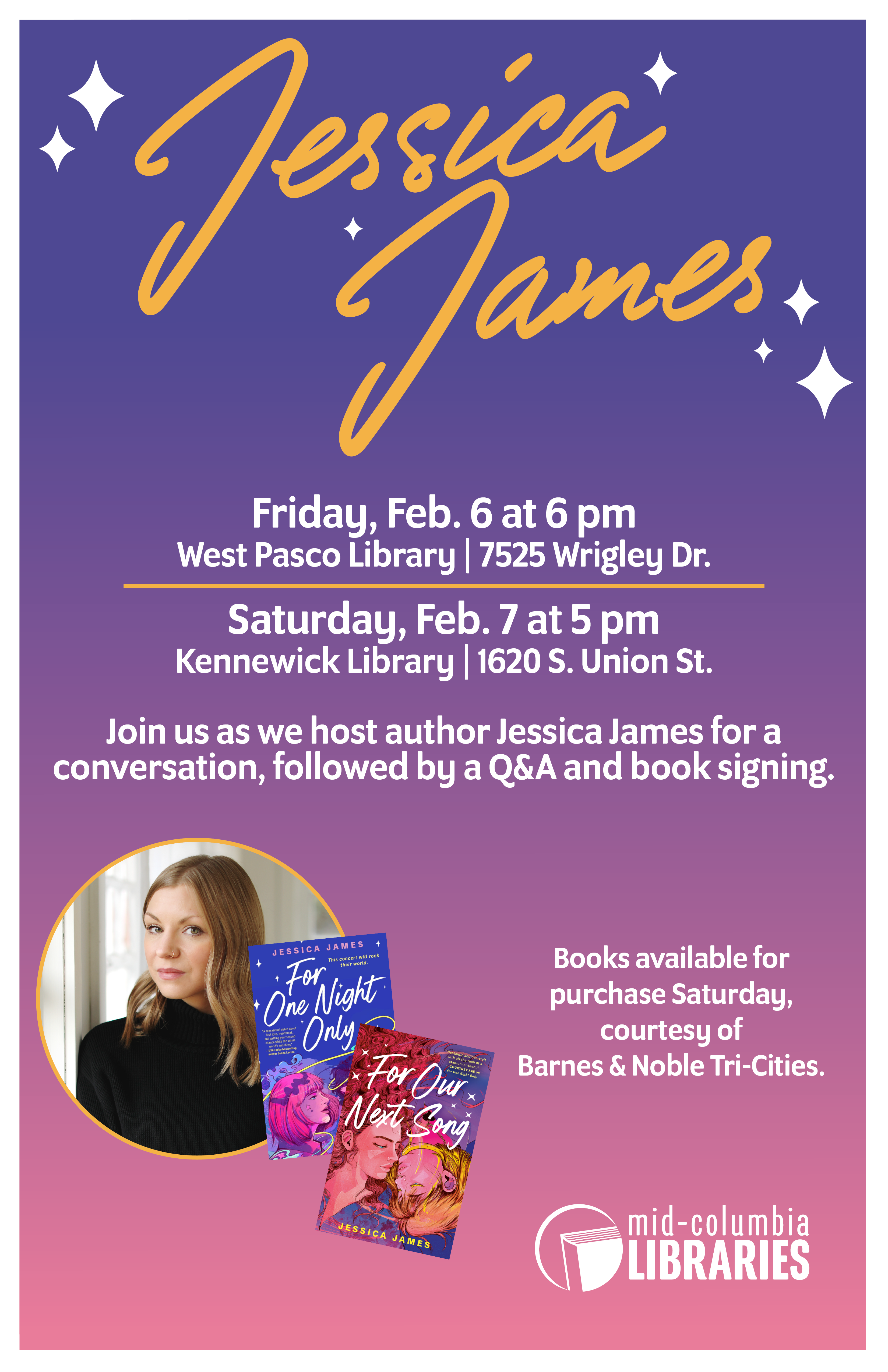 Mid-Columbia Libraries invites the community for an author visit with romance author Jessica James. James writes steamy, heartfelt romance about ambitious women and the people who fall in love with them. Her romance obsession began with strong influences from Jane Austen, Meg Cabot, and early 2000’s rom coms. In November 2021, Jessica was selected as a Pitch Wars mentee for adult contemporary romance. Her debut novel, “For One Night Only,” released on January 7, 2025. “For Our Next Song,” a companion novel, released January 13, 2026.
